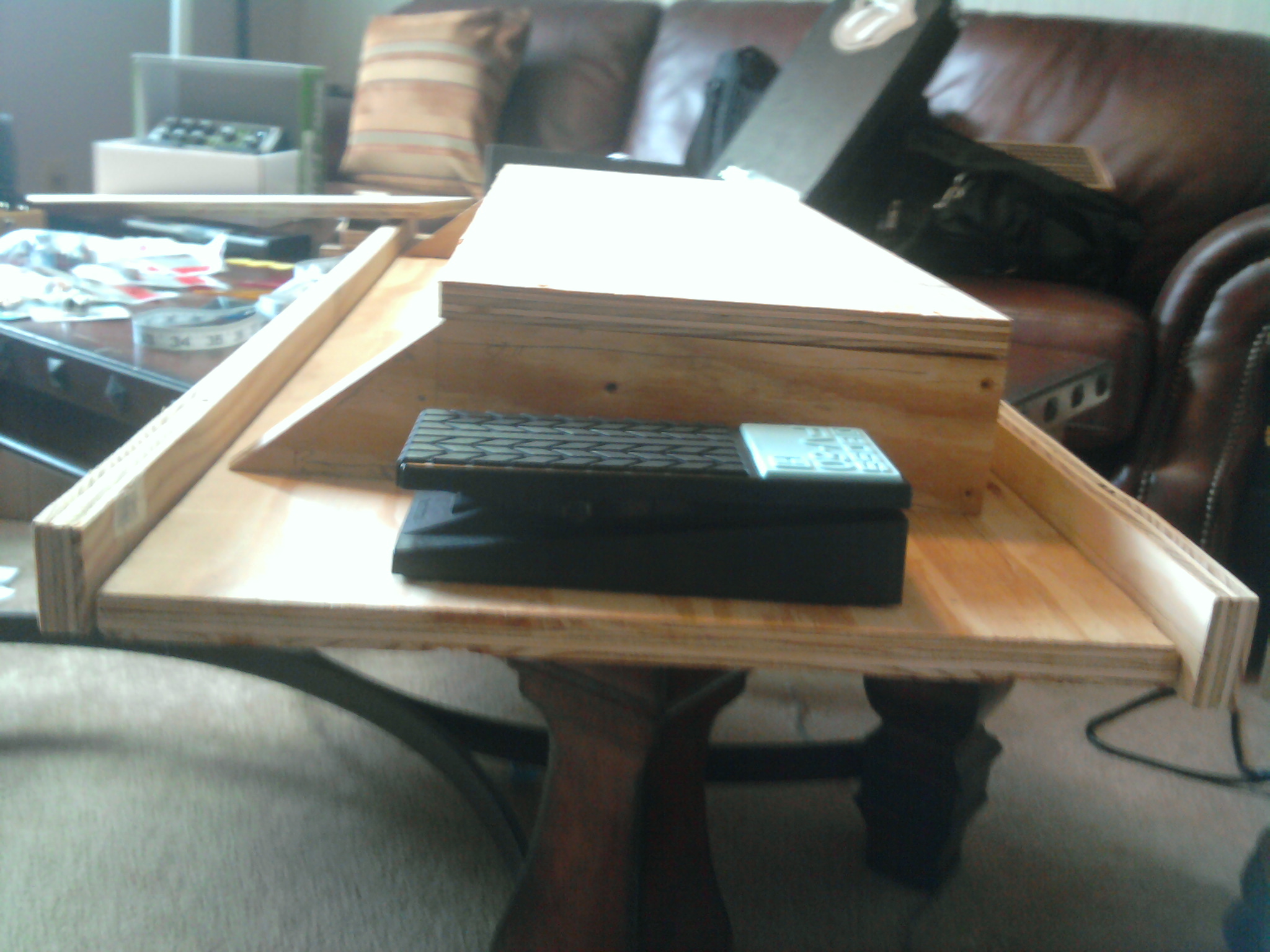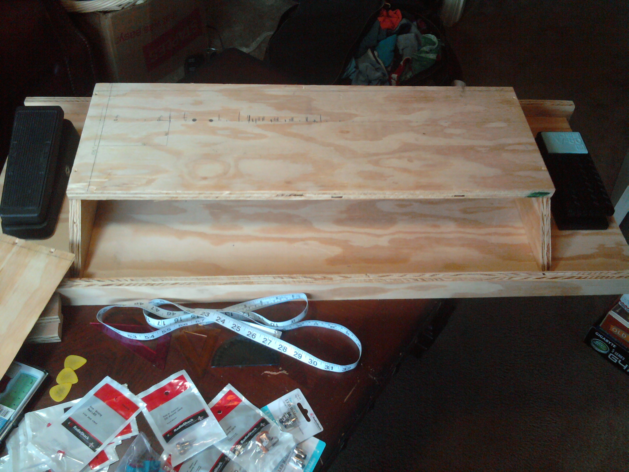 it looks way too tall because the top is wood now instead of sheet metal, the slanted piece is sitting to the left of the pedalboard because i just unscrewed everything for when i get the sheetmetal, i tried to place it on there but it kept sliding off