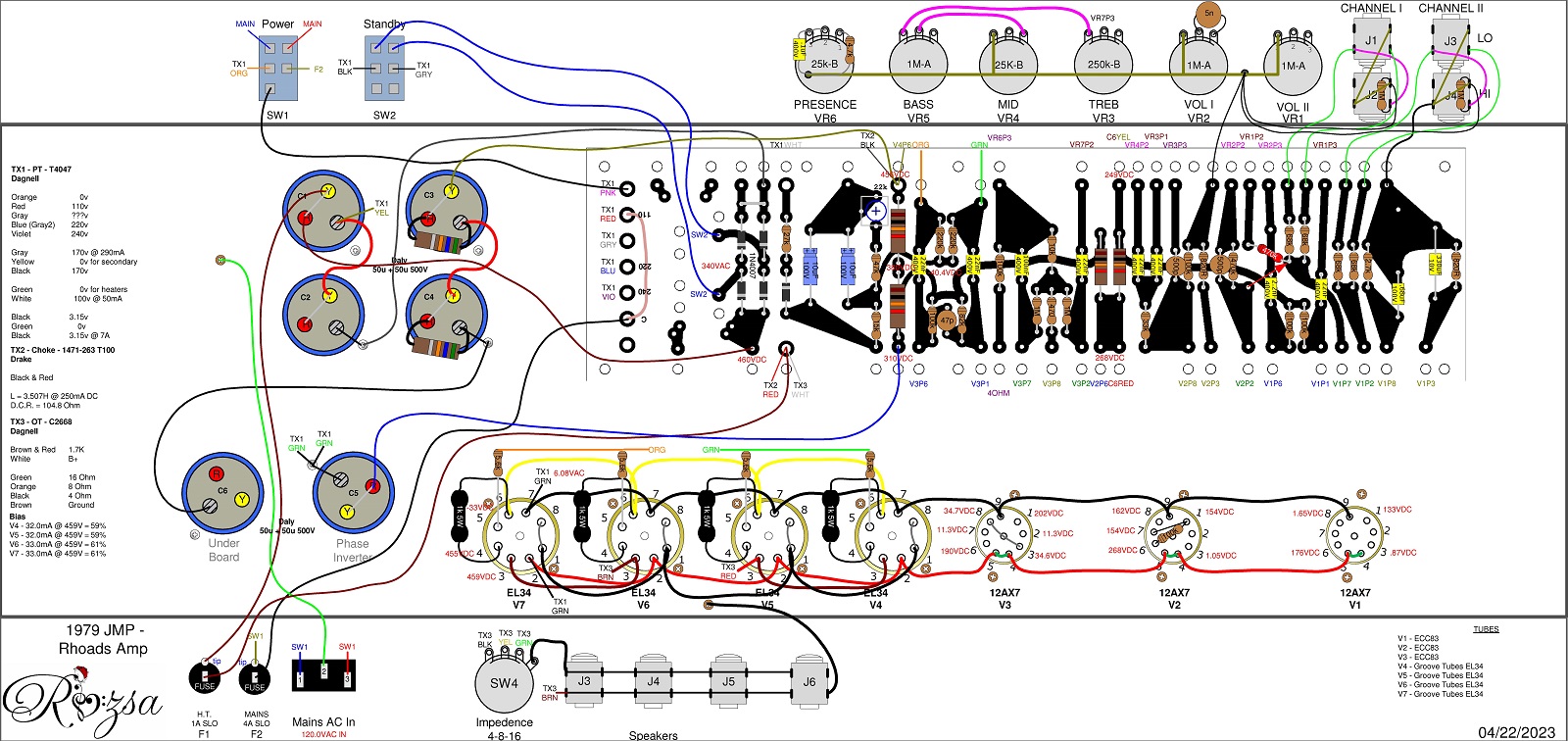 I already blueprinted the 1979 amp and did the layout and took all voltages. The voltages are similar with what the Tribute amp had and 460V on the plates of the original and about 310-315V on the Phase Inverter for both.