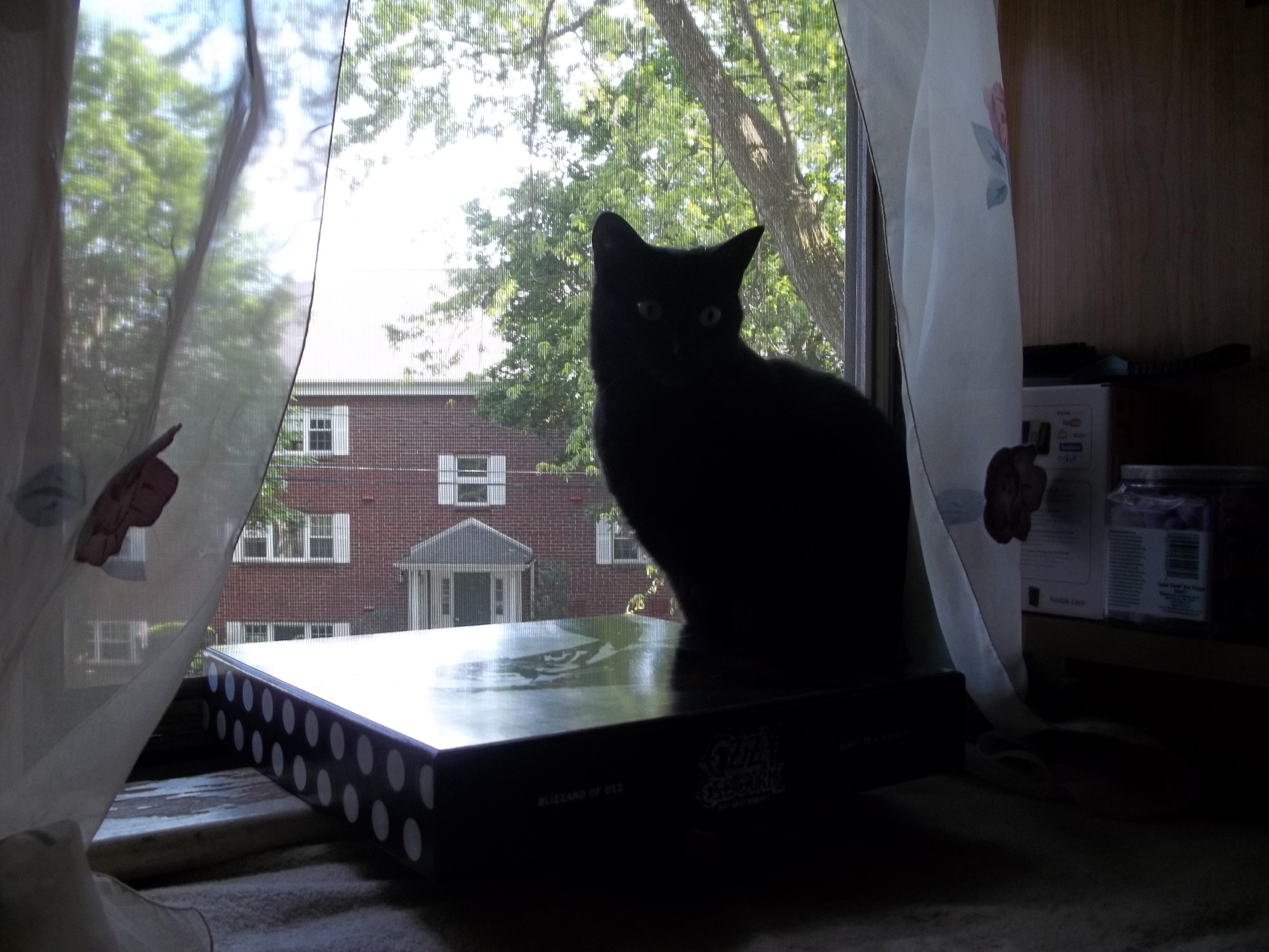 ok here is the deal, my cat is named sabbath, tonight my wife and i are watching the pladium concert and my cat sabbath decides to sit on the ozzy box set and watch randy, i cant make this stuff up so i took pics this is not staged it really just happend.