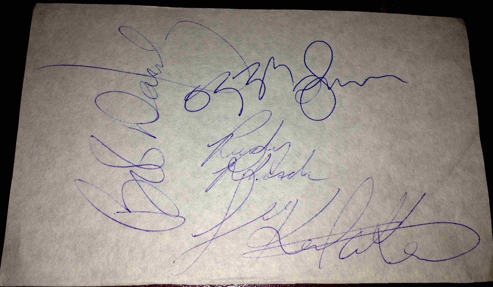 Hi Ben, I gather this one is something you have bought or are you planning on bidding on this lot ?. Yeah it looks good but the forgers are getting better and like the 2 examples above they sold on ebay to some one who thinks they have the real deal. What i have noticed with Randy's signature is how much it changed in such a short time. check out the differences in this one compared to the one in your pic. Lots of differences in how he joined the letters up and the R's. I always look at the 'andy' which is very much the same in all his signatures apart from the 'y' changing slightly. The rest of the signatures look fine, a few here to compare them with. cheers ;-)