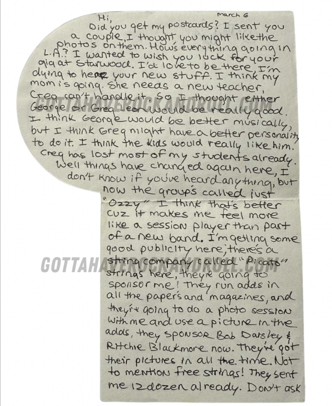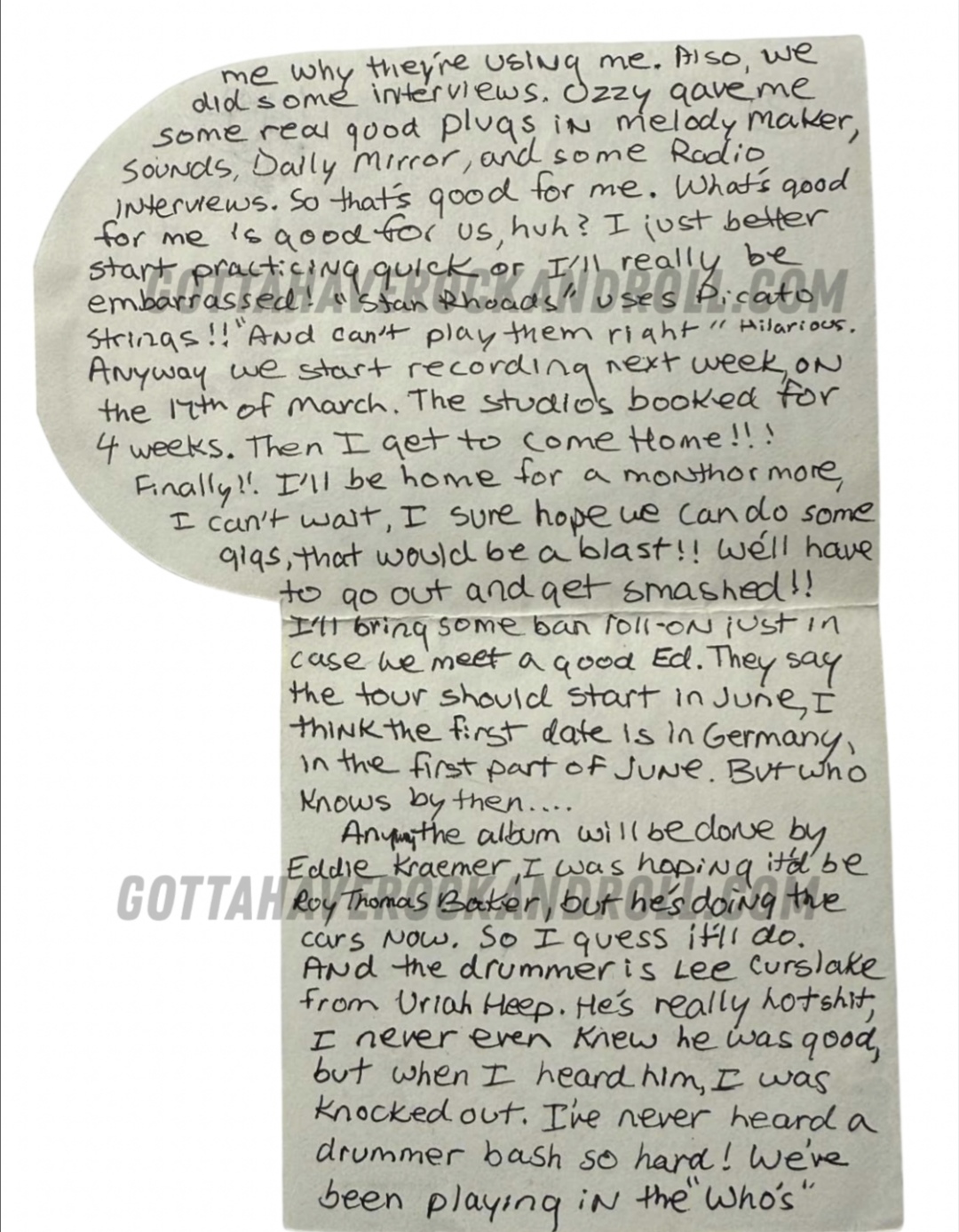 This is an interesting piece, a letter hand wrote to Kevin Dubrow back in 1980. This was a few weeks before they started recording the debut album. It looks like they are still in the stage of writing the album and it's not long after Lee Kerslake has joined the band. A glimpse into a day in the life of Randy Rhoads. Enjoy.