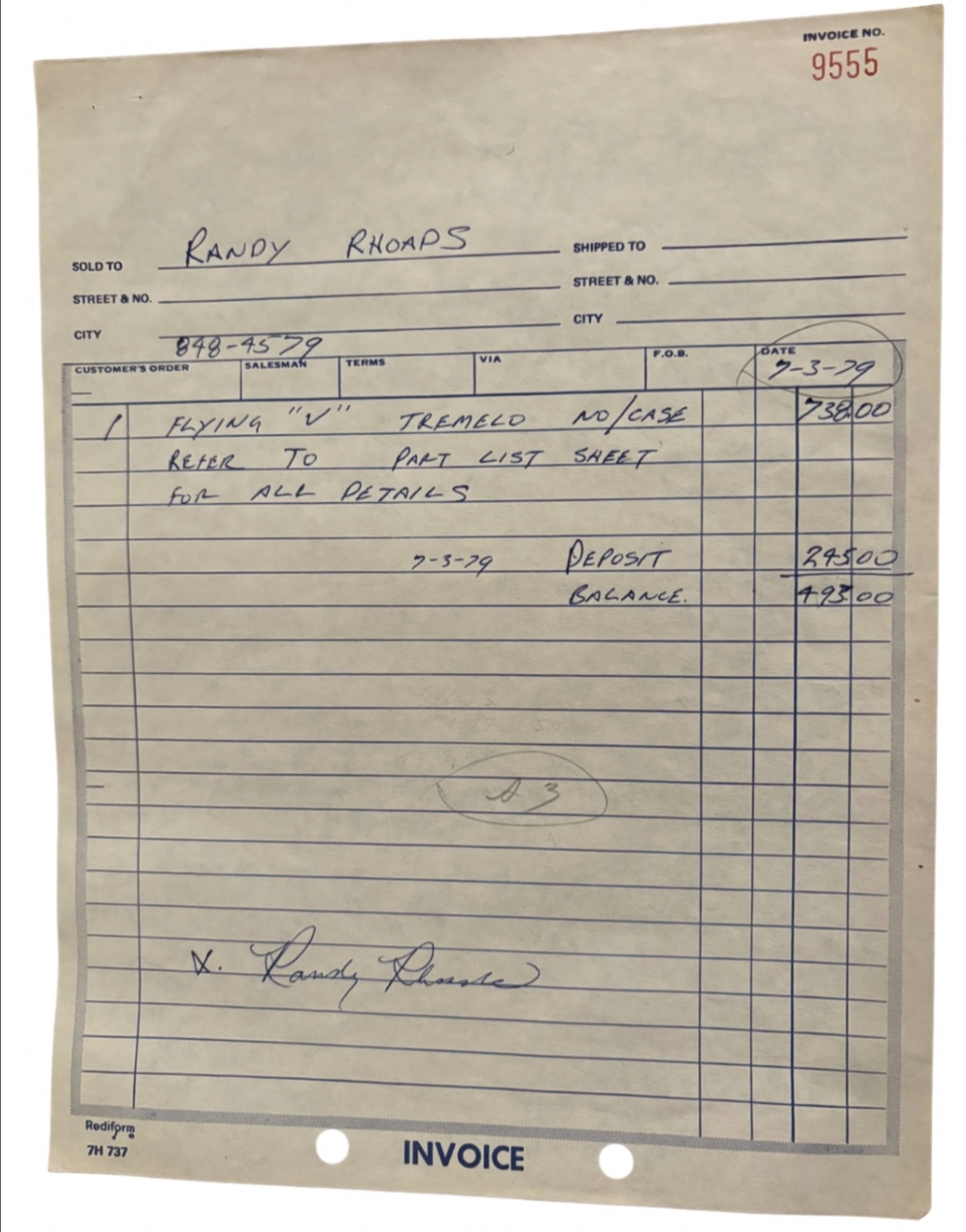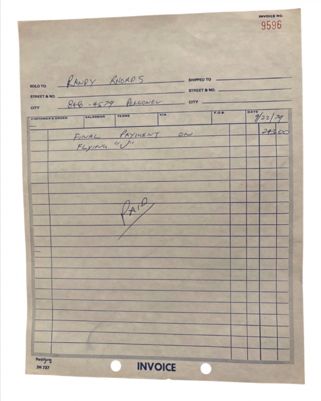 A cool set of drawings and invoices for the sale of the original Karl Sandoval PDV. Specs and breakdown of the parts needed to make this guitar. A great collection and up for auction... Stupidly priced.