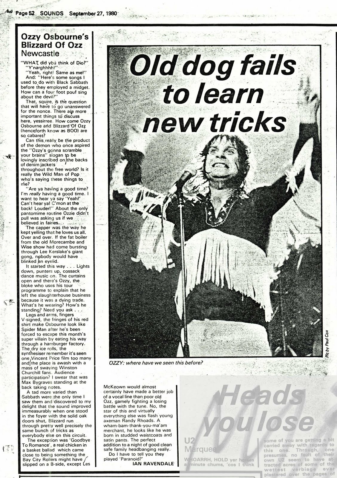 Friday night at the Glasgow Apollo. The houselights were up, roadies milling back and forth onstage yet sizeable pockets of the crowd remained rooted, defiantly calling for more. And backstage it was chaos. Oversized bouncers shoe-horned into their Levis trying to organize the 50 or so jubilant fans determined to claim an autograph and a handshake from their hero, whilst outside another cheery mob lay seige to the stage door. Not a particularly novel scenario it's true, you'd probably find much the same euphoria at a Rod Stewart or Kate Bush bash, but when the hand everyone wants to shake is attached to former Black Sabbath vocalist Ozzy Osbourne then the whole time-honoured ritual assumes a distinctly less hollow significance. Sabbath, y'see, were unique, a band the critics loved to hate and the kids themselves just loved, but for many, myself included, Ozzy was the best thing about them. A working class boy from Brum who got off his arse and made good but who never scorned the ranks from which he'd risen. He was the kids and they really were him, it was really as simple as that. And now, after many moons of soulsearching and footfinding, Ozzy has blown back on to the scene with Blizzard of Ozz, a new band consisting of mostly old faces. On drums we have the redoubtable Lee Kerslake (ex-Uriah Heep / Blind Ambition), on bass Bob Daisley (ex-Widowmaker / Rainbow) and on guitar Randy Rhoads (ex-LA band Quiet Riot and former college guitar tutor), a new name at present but with a lightning technique, smacking of Schenker, Moore and at times Hendrix. It shouldn't be long before he gains the clenched-fisted approval of the denim cognoscenti. As the Apollo was the first date on the band's 17-date nation-wide tour and, with the exception of two "secret" gigs in Blackpool and Cromer under the name Law, their first live appearance together there was a good deal of pre-gig tension backstage. Happily, though, that's where it remained despite a few technical hitches the evening proved a joyful celebration of Ozzy's return with every one of the two thousand plus crowd willing them to do well and the spotlessly attired Ozz obliging them.