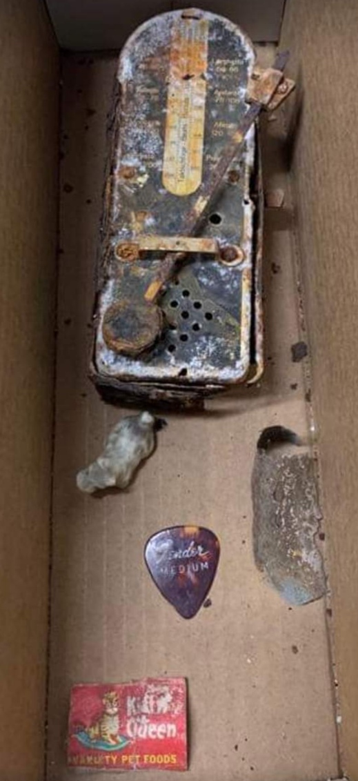 A couple of items found in Randy's car during the restoration. An old metronome and one of his guitar picks.