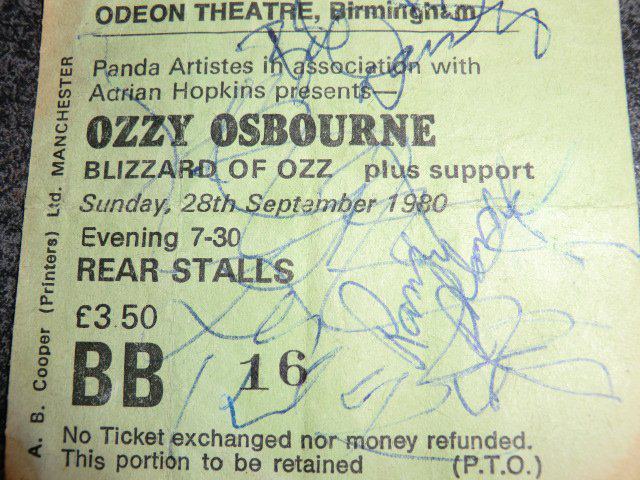 A genuine fully signed Ozzy ticket from the 1980 Blizzard UK tour.