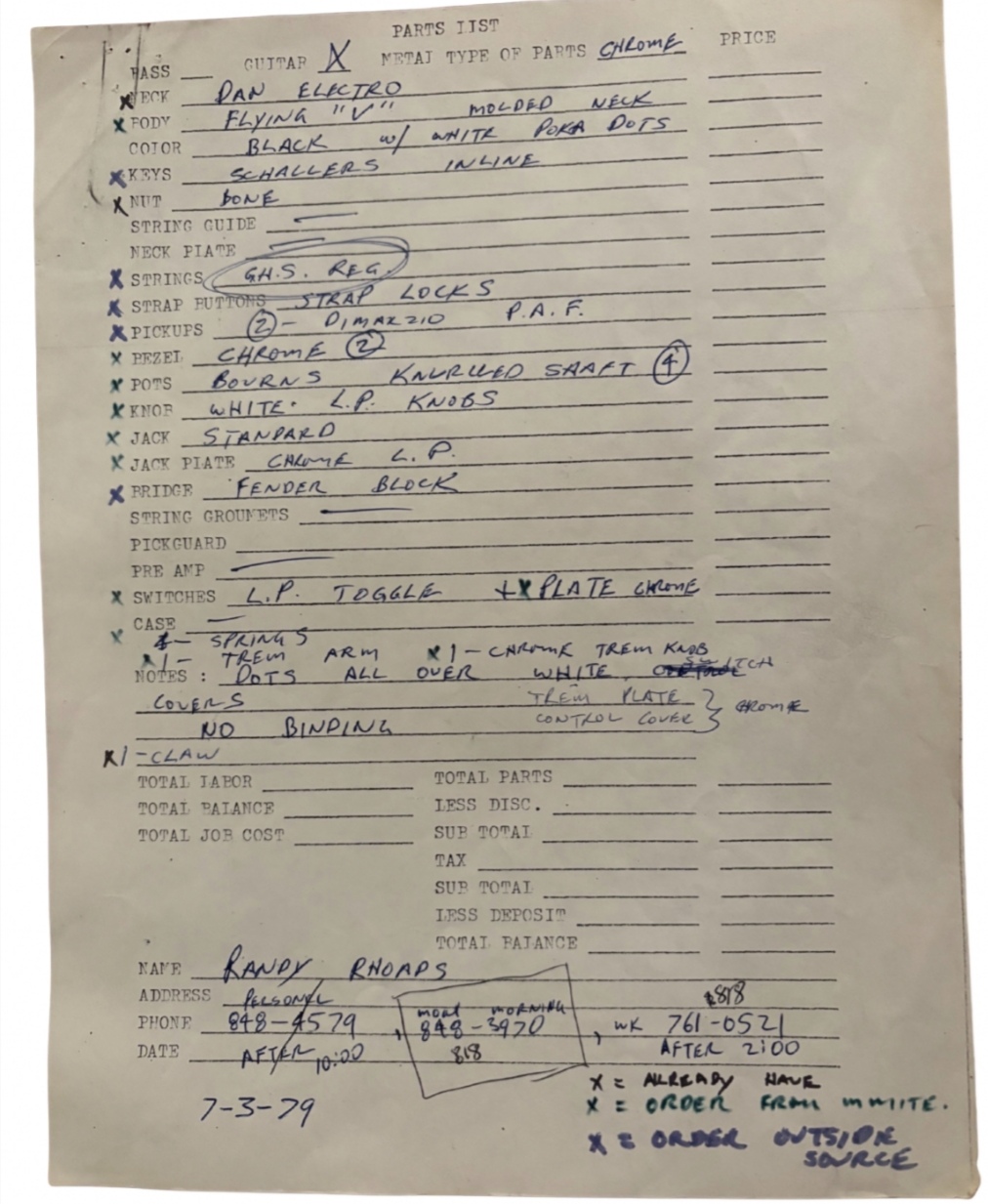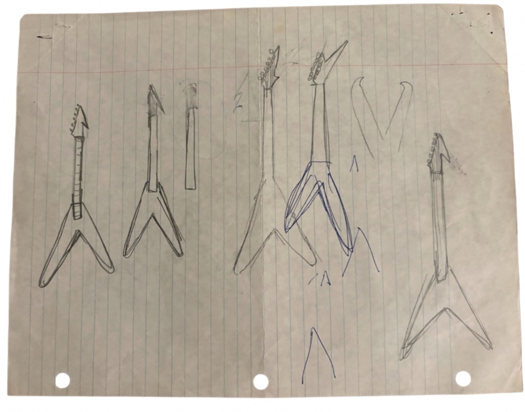 A cool set of drawings and invoices for the sale of the original Karl Sandoval PDV. Specs and breakdown of the parts needed to make this guitar. A great collection and up for auction... Stupidly priced.