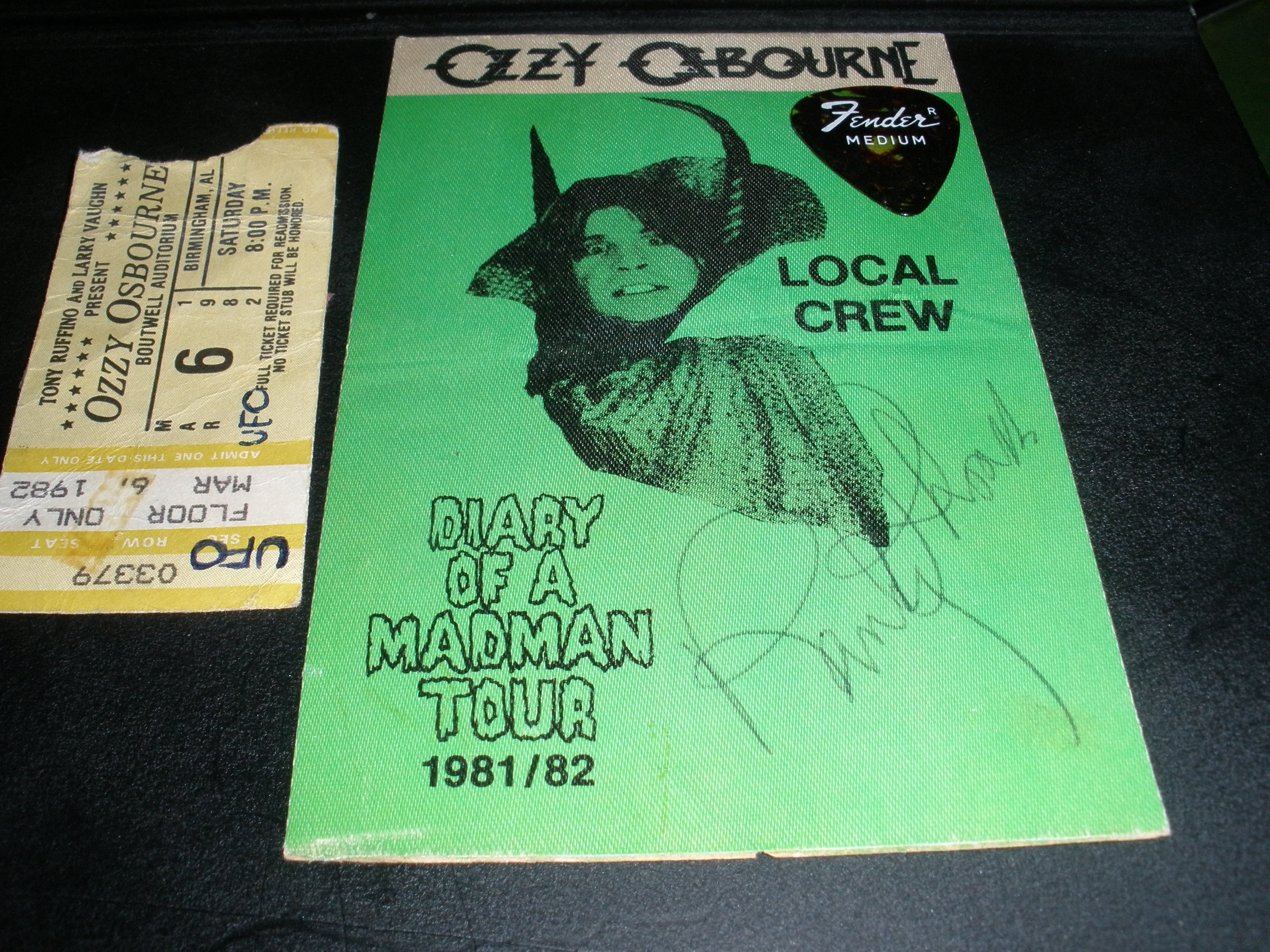 My first post here--I do like this site and just found it-glad to see others still into RR..Anyway I saw the D.O.A.M tour in B-ham AL and was blown away by Randys live sound as I play guitar also and had found a new favorite with Rhoads. After the show the bus is in back of the hall so like Ive done before I walk around and wait for the band to come out. Well Randy and Rudy have already got on the bus. I see Randy in the window drinking a Michelob and watching tv on the drivers side of the bus. I tap on the bus drivers window and ask him to get Randy to sign a Diary backstage pass for me that some roadie had just given me..He gets up and hands it to Randy and he signs it and then hands it back to me..I asked him to get Randy to come talk to me but its cold and raining and RR declines..Later Tommy comes out and some drunk guy is right at the bottom of the stairs and falls down and Tommy walks right over him.. I left after that as it was cold. Yep its the same bus in the crash and I assume the same driver of the plane..A portly guy with a moustache I do recall..Weird I touched hands with the guy that killed RR a few weeks later