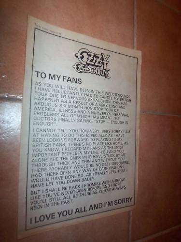 This was in the Sounds magazine in December 1981 it is an apology from Ozzy to the fans explaining why he cancelled most of the UK tour dates in 1981.