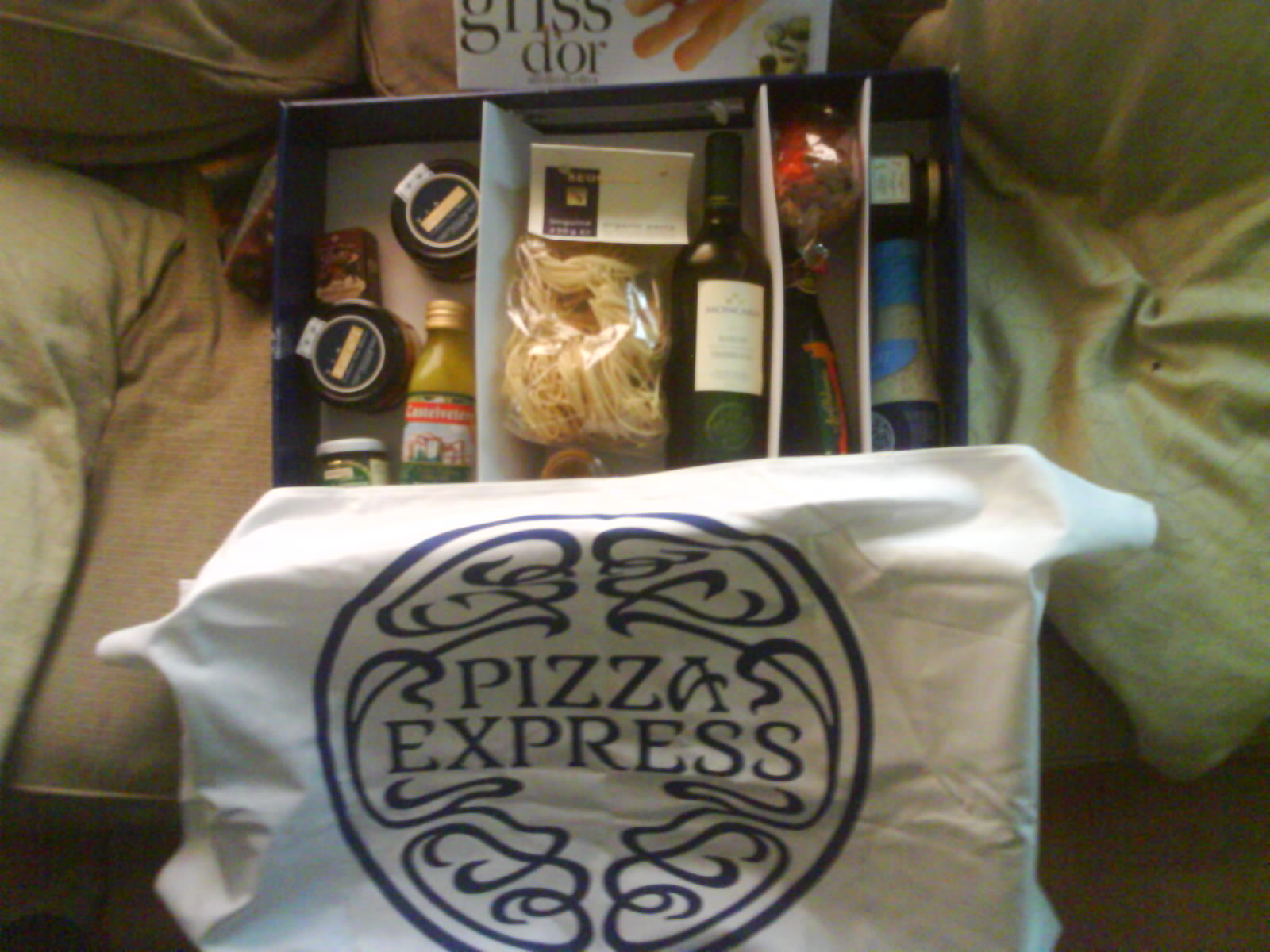 Anyway out the blue the waiter and also friend Ahmed just showed up at our house, and bought around the coolest Christmas Pizza Express hamper with Wine, Pasta, Sauce, Olive Oil, Dressing, Pesto etc etc...