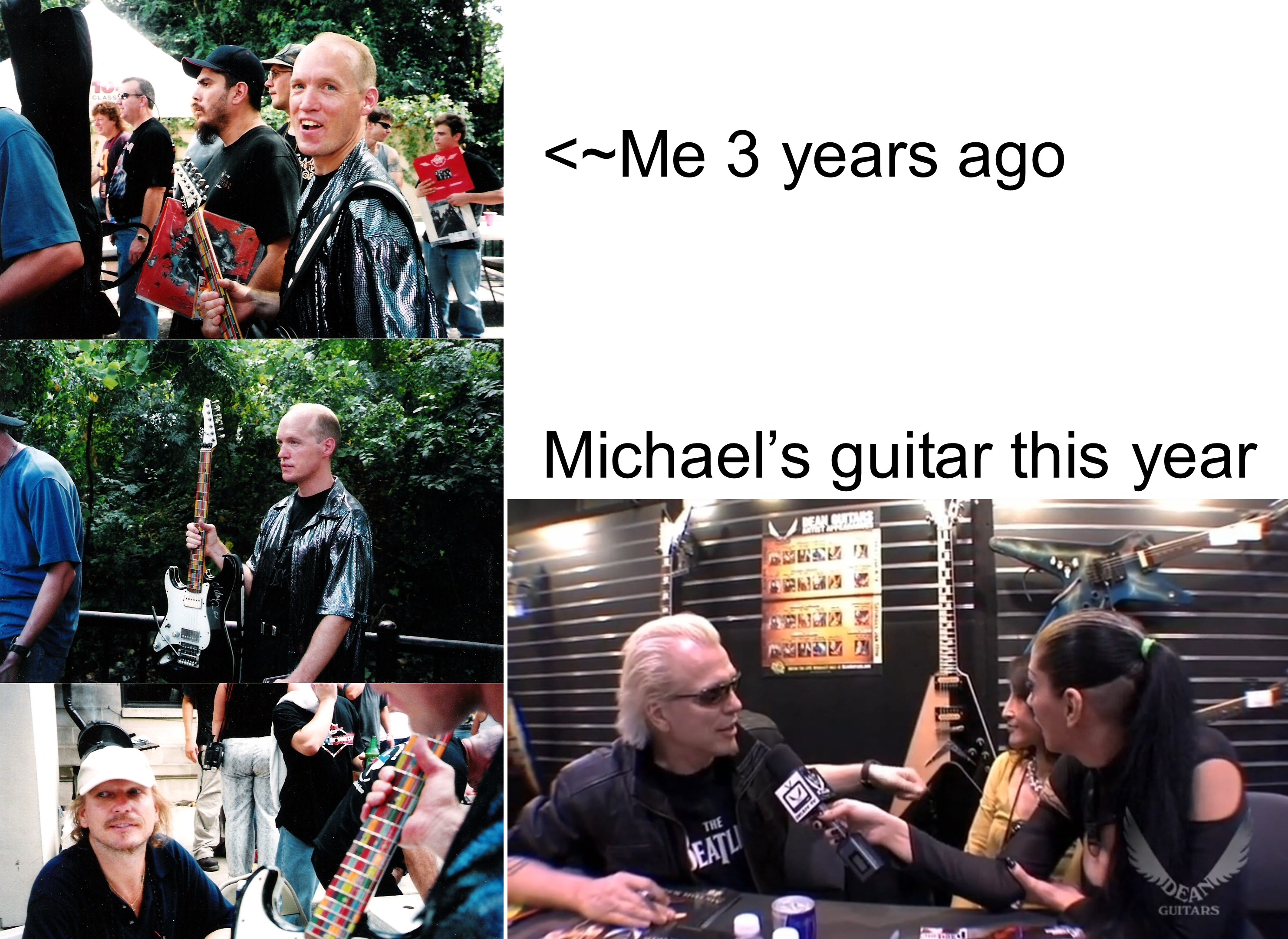 It only took me three years to contribute to this thread. Better late than never. This is me at a Michael Schenker signing. He was super cool and signed my gutar. I think it even inspired one of his custom guitars which he put on display at the NAMM show. What do you think?