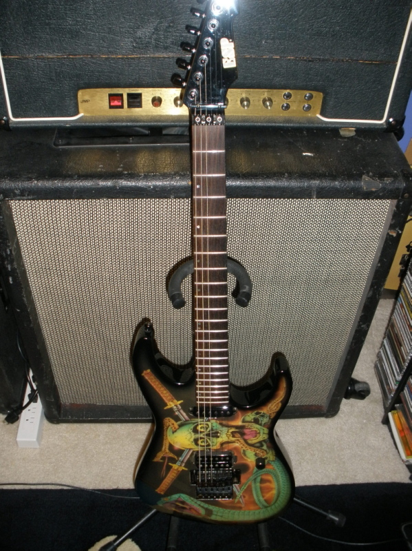 I am looking to trade a early 90s ESP George Lynch skulls and snakes guitar for a EVH 5150 III amp. The guitar is in good condition and has a esp strat style neck with dot inlays-Duncan distortion p.up and esp single coil-original floyd rose and original case. I would trade the guitar plus 300 cash for the right amp. Black or white color. I can send pics if interested.